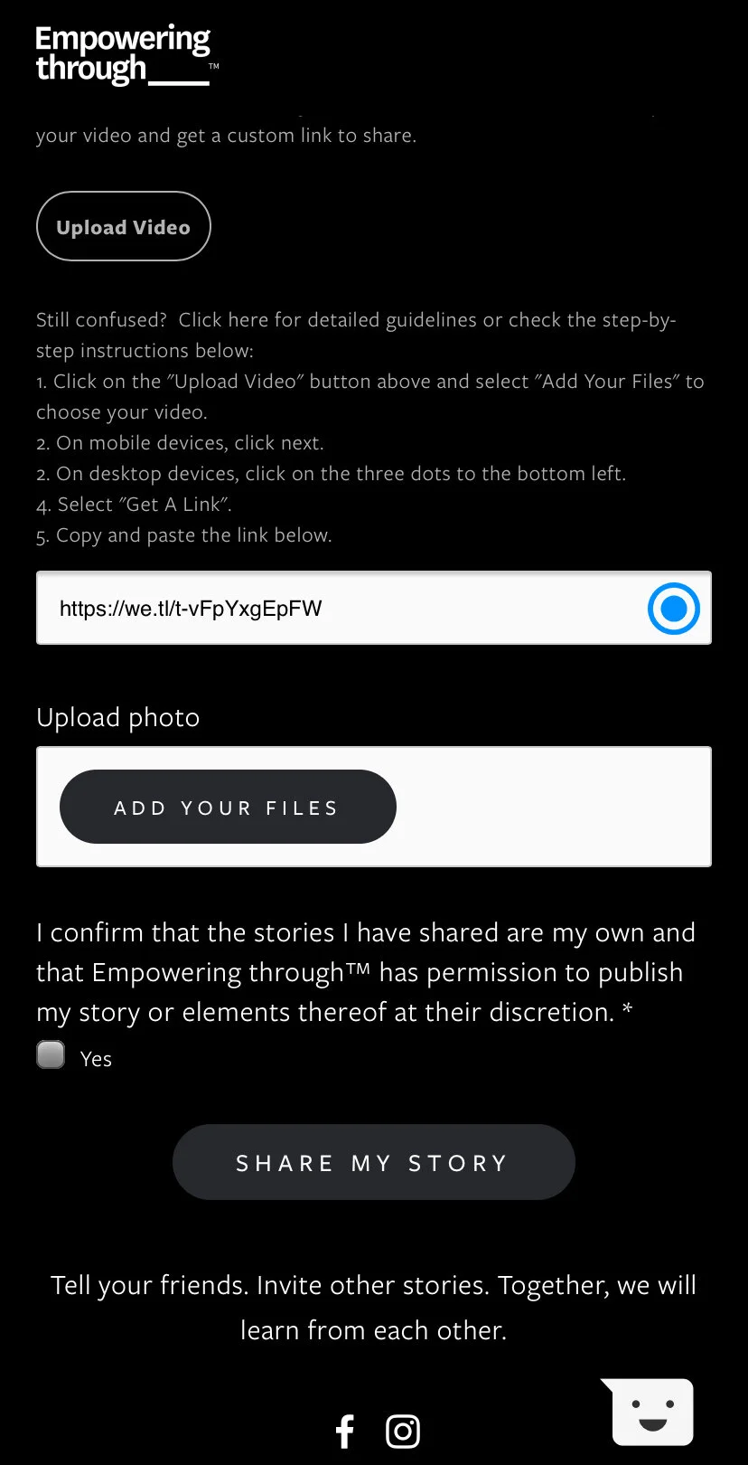 Tick the “Yes” checkbox to confirm that the stories you have shared are your own and that Empowering through™ has permission to publish your story or elements thereof at their discretion.